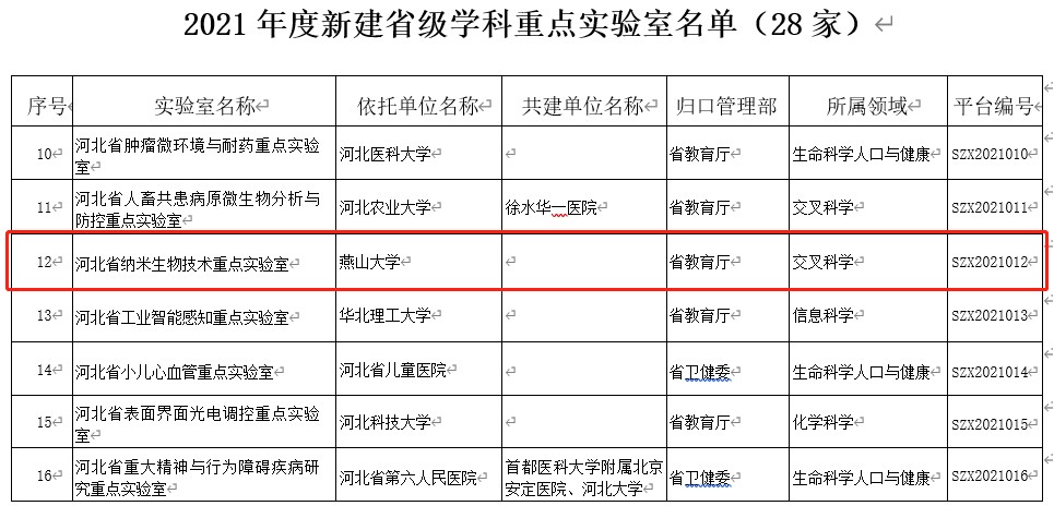 2021年08月16日燕山大学获批河北省纳米生物技术重点实验室