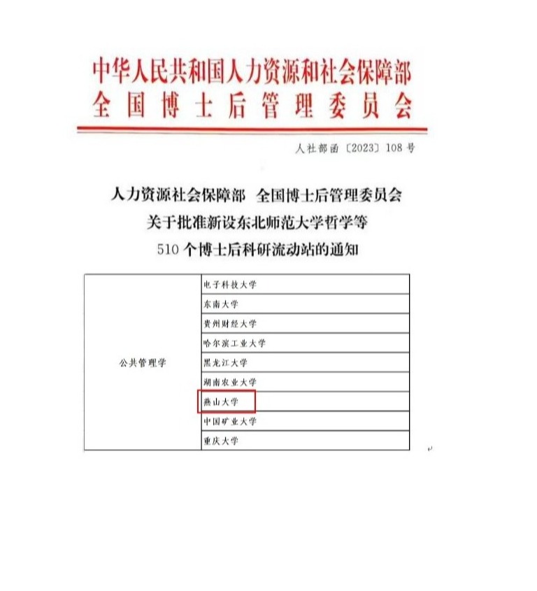 【新闻中心讯】近日,国家人力资源和社会保障部、全国博士后管理委员会联合下发《关于批准设立东北师范大学哲学等510个博士后科研流动站的通知》,公布了2023年获批新设博士后科研流动站名单,燕山大学申报的公共管理学博士后科研流动站成功获批。至此,我校博士后科研流动站增至12个,涵盖学科门类进一步拓宽。燕山大学文法学院公共管理学科历经20多年的潜心建设与发展,目前拥有行政管理和公共事业管理两个国家级一流本科专业...