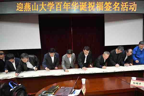 赵险峰对中国重型院的热情接待和多年来对燕山大学的大力支持表示衷心感谢,对中国重型院近年来发展取得的成绩表示由衷祝贺。他指出,校企双方有很深渊源,中国重型院是燕大校友的汇聚之地,广大校友传承奋斗基因和报国之志,做出了突出成绩。希望校企双方在人才培养、科技攻关、产出成果等方面开展全方位深度合作,携手并进,共同服务国家需求和行业发展。赵丁选介绍了学校的主要情况,就学校在机械、材料等领域的突出科研成就进行了重点讲解。谢东钢、王建国等校友代表分别作了发言,大家欢迎校领导来访,回顾了自己在母校的学习历程,纷纷表达对母校的感恩之情,对母校发展成就和规划感到很振奋,祝福母校未来更加美好。最后,大家在迎接燕山大学百年华诞的祝福书卷上签名并合影留念。