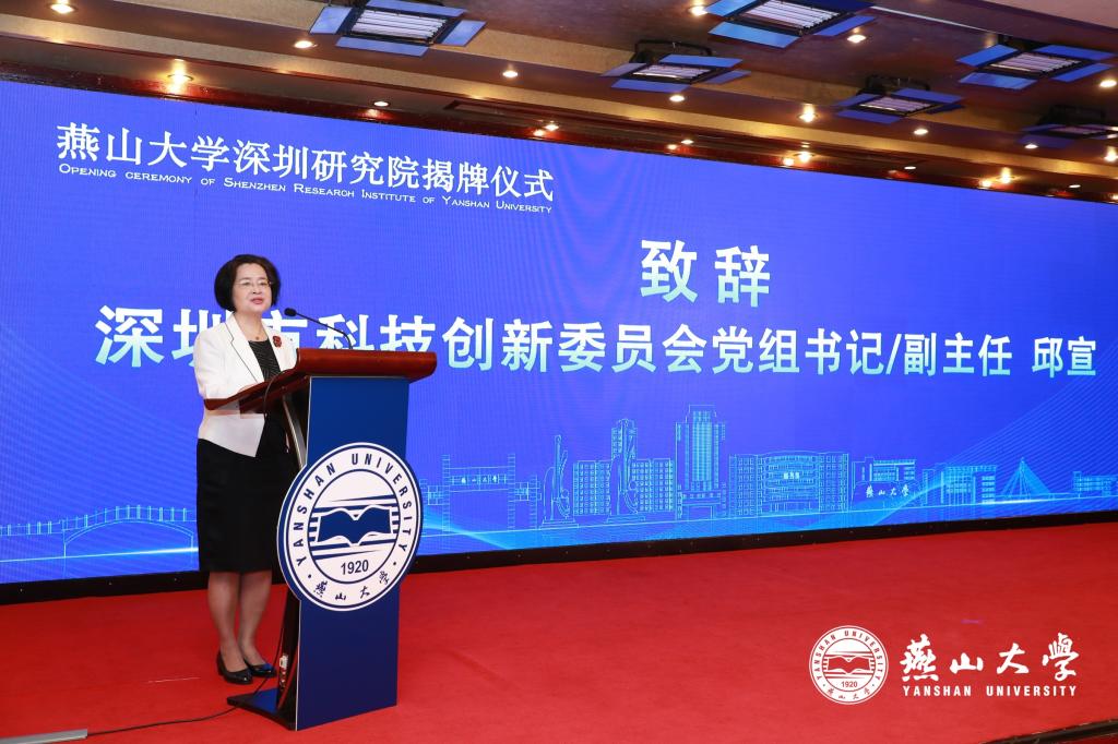 邱宣代表深圳市科技创新委员会致辞。她表示,深圳市科创委历来十分重视和鼓励高校到深圳发展,支持各院校在深圳虚拟大学园这个平台上先行先试、有所作为。深圳市科创委将全力支持燕山大学深圳研究院建设,力争共同将研究院打造成深圳与河北高校合作的典范。她希望,燕山大学在深圳这块充满希望的热土上充分发挥自身优势,培养顶尖人才、引领科技创新、促进产业发展,服务深圳改革创新。