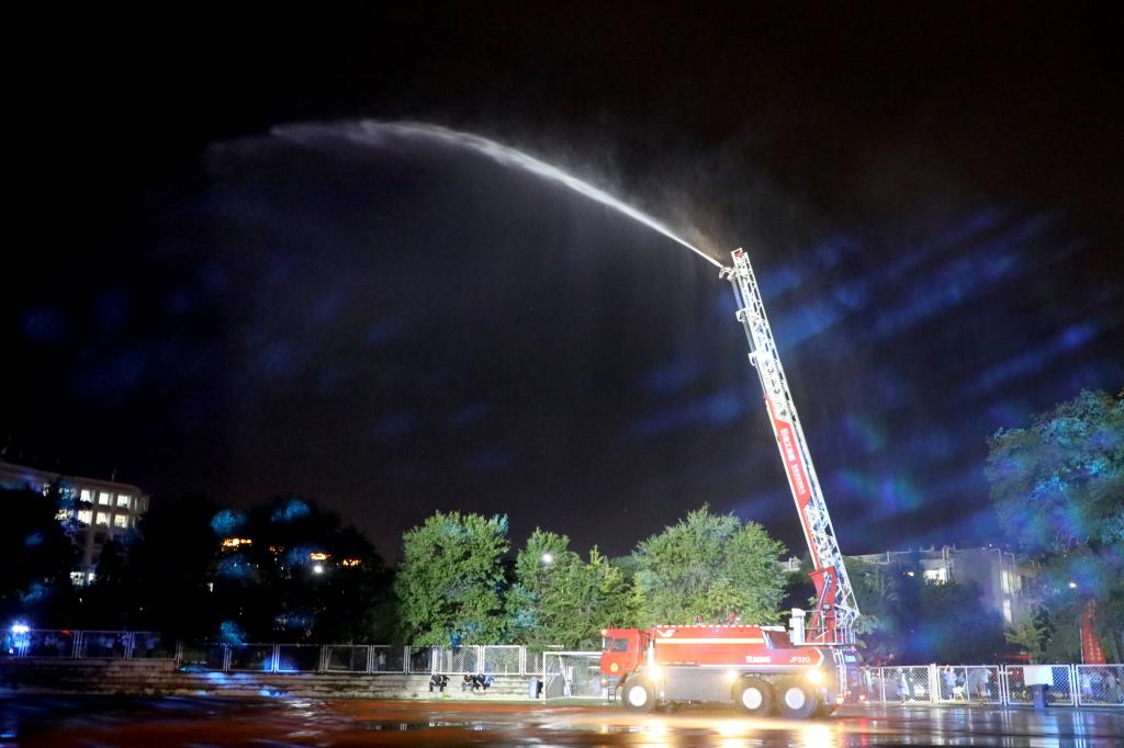 高机动多功能举高消防车在行进中喷洒