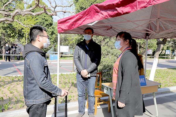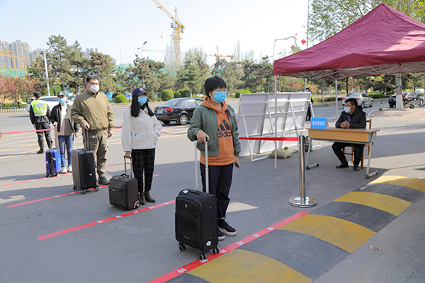 返校学生准备进入体温检测区