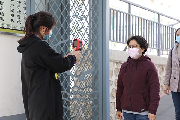 学生进宿舍前进行体温检测