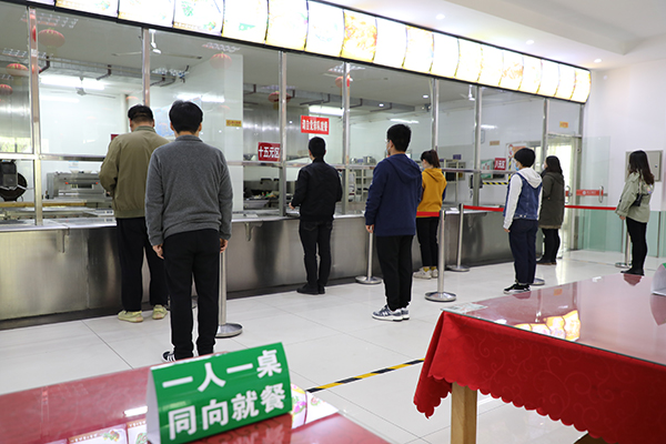 学生间隔一米在食堂取餐
