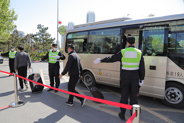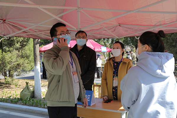 “疫情防控演练开始!” 随着副校长于树江一声令下,由辅导员扮演的“学生”及“家长”乘坐公交车(大巴车)或自驾车到达指定停靠点下车,在现场工作人员指挥下,在资格审核点排队进行返校资格审核。随后,按照入校“一测二核三查四通过”程序,返校学生逐一通过测温门、身份核查处和“河北健康码”查验处。对学生丢失一卡通、出现体温发热症状、学生身份查验异常、“河北健康码”为黄码等突发情况进行了演练。