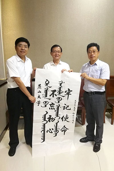 欣闻燕山大学明年将迎来溯源建校一百年、独立办学一甲子,钮茂生用满汉文合书“不忘初心、牢记使命”赠与学校。他希望燕山大学不忘初心育英才、牢记使命铸重器,砥砺奋进、矢志报国,早日实现国家“双一流”和“特色鲜明、国内一流、世界知名的研究型大学”的办学目标,为实现中华民族伟大复兴的中国梦贡献更大力量。 (编辑 蔡巧怡)