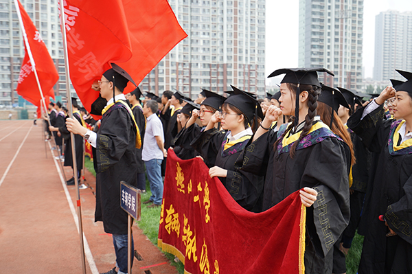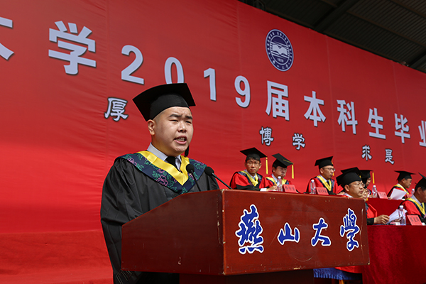 承载着母校的希望、校长的祝愿,全体毕业生在即将赴清华大学攻读硕士学位的信息科学与工程学院毕业生李丹阳的带领下,进行出征宣誓:“仰燕山壮志,怀渤海雄襟;厚德载物,博学知礼,求是笃行;铭记师长教诲,感念母校深情;弘扬燕大精神、承继百年荣光;不负赤子雄心,奏响时代华章;中流击水,勇于担当;以身许国,再创辉煌!”铮铮誓言,传递了2019届全体毕业生对母校的感恩之情,展示了他们报效祖国的赤子雄心。
