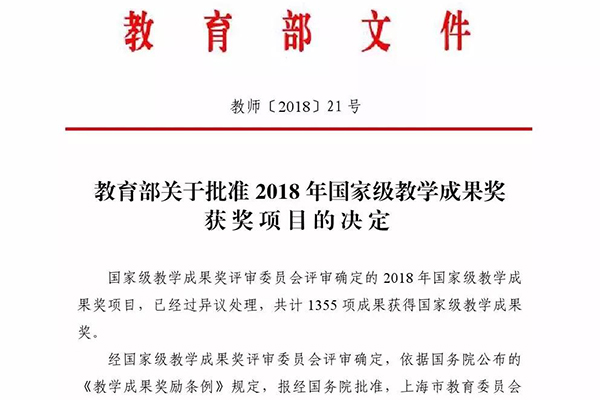 【新闻中心讯】近日,教育部正式发布了《关于批准2018年国家级教学成果奖获奖项目的决定》(教师[2018]21号),我校申报的“基于工程教育国际实质等效的‘三三三’人才培养模式构建与实施”成果喜获2018年高等教育国家级教学成果奖二等奖。