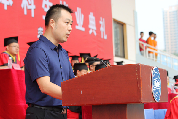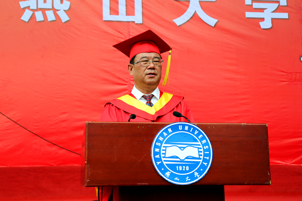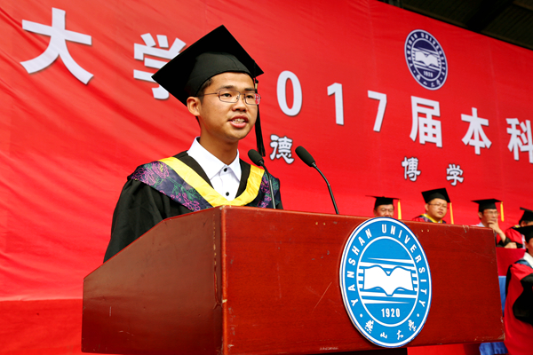 毕业生代表,燕山大学2016年大学生年度人物、燕山大学2017届“最美毕业生”、河北省优秀毕业生获得者,车辆与能源学院曾祥端同学在发言中回忆了逐梦燕园的美好片段,他表示是母校教会了他坚持、勤奋、创新和奉献,使他毅然决然的选择奔赴青海省德令哈市支教,努力回报社会,并将燕大精神发扬光大。机械工程学院毕业生李博同学的母亲武燕女士作为家长代表,向学校和老师们表示感谢和祝福,是学校和老师在孩子迷失方向的时候及时为其把舵领航,助力他最终考取哈尔滨工业大学研究生。校友代表,建筑工程与力学学院2004届土木工程专业毕业生、中冶沈勘秦皇岛工程设计研究总院有限公司副总经理李刚分享了七年燕园求学记忆、十年职场拼搏历程,感恩母校对他的培养,鼓励毕业生要脚踏实地迎接绚丽璀璨的明天。