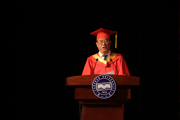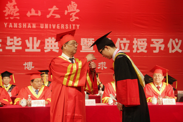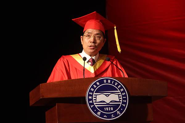 副校长赵丁选和张福成分别宣读了燕山大学研究生毕业文件和学位授予文件。夏超群同学代表毕业生发言,他衷心地感谢母校的培育,感谢老师的培养,感谢同学的帮助,感谢亲人的支持,并决心用所学知识传承并发扬燕大精神,回报母校和社会。导师代表、机械工程学院博士生导师高殿荣教授代表研究生导师发言,他对即将走出校园的毕业生寄予深情期望,希望他们树立远大理想和抱负,继续不断学习,把握时代进步的脉搏,敢于创新,勇于探索,为科技创新和社会发展做出自己的贡献。