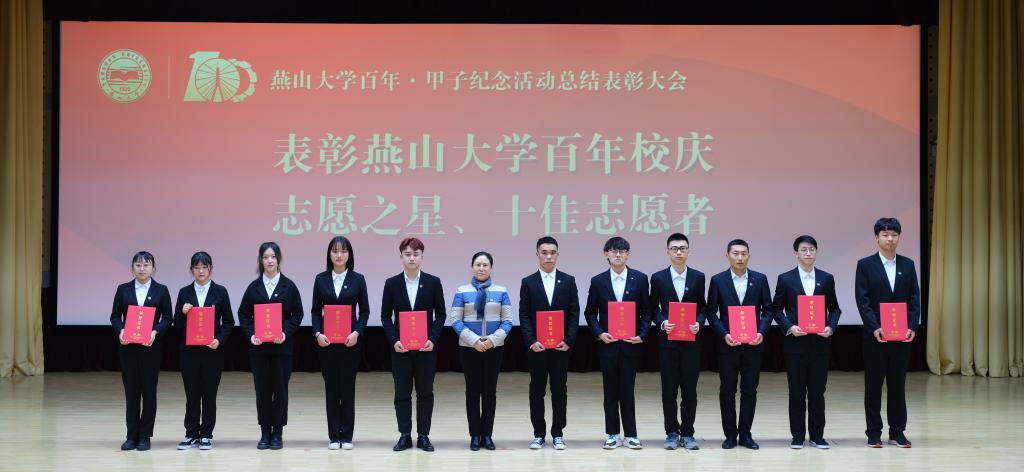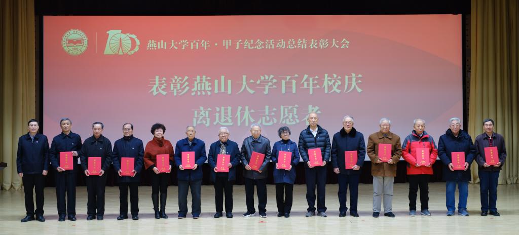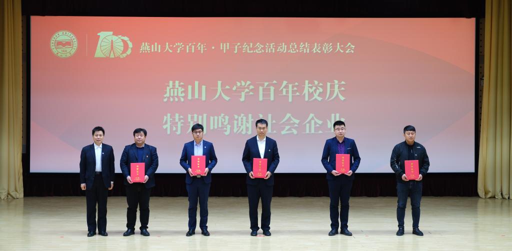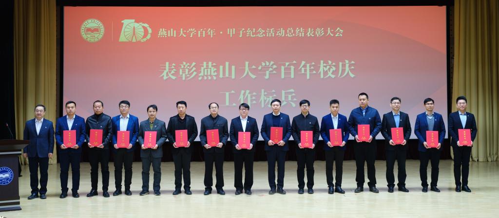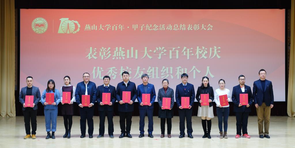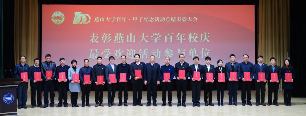 燕山大学党委常委、副校长任家东同志宣读了《关于表彰燕山大学百年·甲子纪念活动先优单位和个人的决定》。学校授予“重走南迁路,再抒创业情骑行活动”等20项活动为最受欢迎活动奖,王志宙等36位教职工为校庆工作标兵,丁玲等91位教职工为校庆工作先进个人,白靖等19位离退休人员为校庆工作优秀志愿者,王旭杰等10位同学为百年校庆志愿之星,马金磊等10位同学为百年校庆十佳志愿者,肖楠等311位同学为校庆工作优秀志愿者,大庆校友会等20个校友会为校庆工作优秀校友会,王惠文等233人为校庆工作优秀校友,汇川技术股份有限公司校友等3个校友集体为校庆工作先进校友团体,秦皇岛银行股份有限公司等7个校庆特别鸣谢单位。随后,与会校领导为获奖单位及个人颁发荣誉证书。