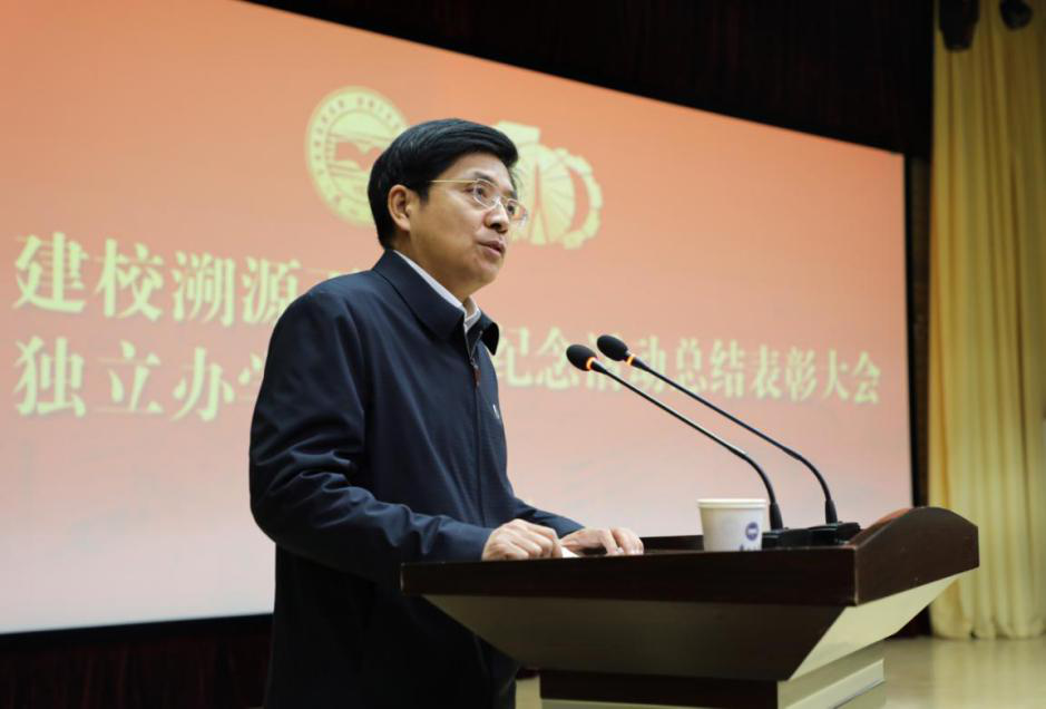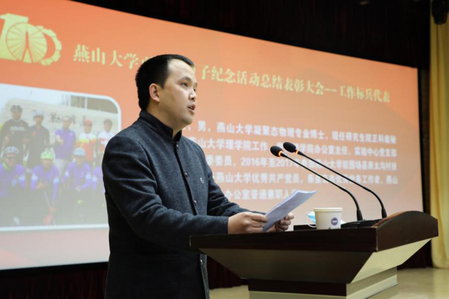 燕山大学党委书记赵险峰在会上讲话。他代表学校党委向受到表彰的集体和个人表示热烈的祝贺!向参与校庆工作的各个部门、学院和全体工作人员、志愿者,向关心支持校庆活动的广大校友和社会各界表示衷心的感谢,并致以崇高的敬意!赵险峰表示,成绩来之不易,经验弥足珍贵。我们要牢记初心,努力培养担当民族复兴大任的时代新人。我们要攻坚克难,加快推进“双一流”建设。我们要抢抓机遇,谋深谋实“十四五”规划。我们要立足长远,全面提高治理体系和治理能力现代化水平。我们要齐心协力,全力确保“十三五”圆满收官和年度目标任务高质量完成。
