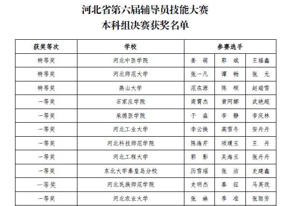 【新闻中心讯】5月28日,中共河北省委教育工委、河北省教育厅下发了《关于公布河北省第六届高校辅导员职业技能大赛结果的通知》(冀教德育函〔2021〕36号),在河北省第六届高校辅导员素质能力大赛(本科组)决赛中,我校选手获得团体特等奖以及主题班会、谈心谈话单项奖2项。