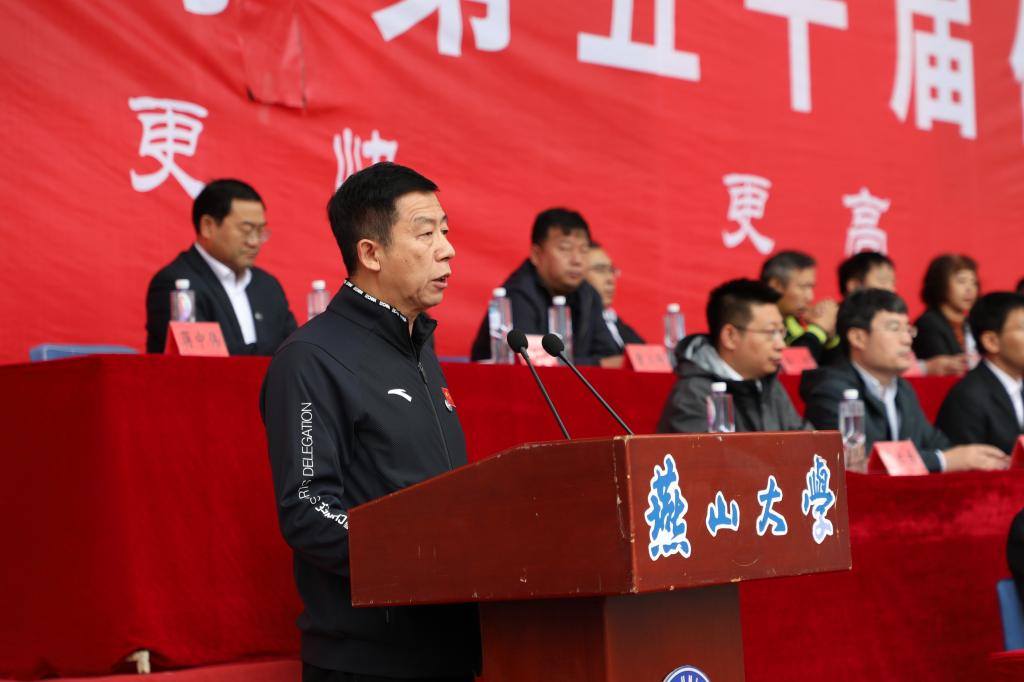 副校长赵永生致开幕词,他表示,体育是社会发展和人类进步的重要标志,是综合国力和社会文明程度的重要体现。燕大百年办学历史也融汇了发展体育运动、增强人民体质的办学实践,一代代东重人、燕大人在体育运动中强健体魄、磨炼意志、凝聚人心,人人参与体育、人人乐享健康的热潮奔涌在美丽燕园。2020年学校参与跑步人数17938人,累计跑步总里程达355.6万公里。一年来,在健美操、花样跳绳等各类大学生竞赛项目中,共获得国家级竞赛第一名16项、第二名3项,帆船队在全国大学生运动会中获得了第八名的优异成绩。燕山大学也用实际行动支持国家体育事业的发展,积极推进冰雪运动进校园活动,同时选派干部担任北京2022年冬奥会志愿者经理和赛事服务经理,优选出350名赛会志愿者,选派150名表演志愿者,开展14门技能培训课程,为服务冬奥做好充分准备,更展现了燕大人的体育担当。他表示,今年恰逢中国共产党成立100周年,我们要用党的光辉历程和伟大成就鼓舞斗志、明确方向,全校师生员工更要积极投身到体育锻炼中去,用健康的体魄成就精彩的人生。