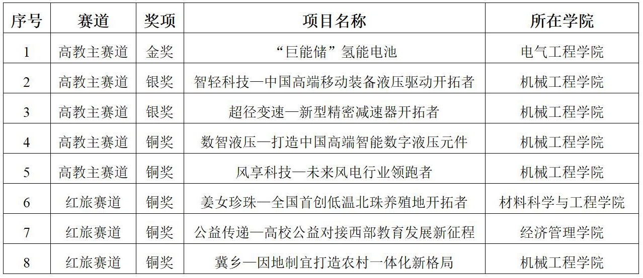 本届大赛我校共3个项目入围全国总决赛现场赛。其中,来自电气工程学院的“‘巨能储’氢能电池”项目在大赛最核心的高教主赛道中获得河北省参赛历史首金,来自机械工程学院的“智轻科技—中国高端移动装备液压驱动开拓者”项目和“超径变速—新型精密减速器开拓者”项目分别获得银奖。