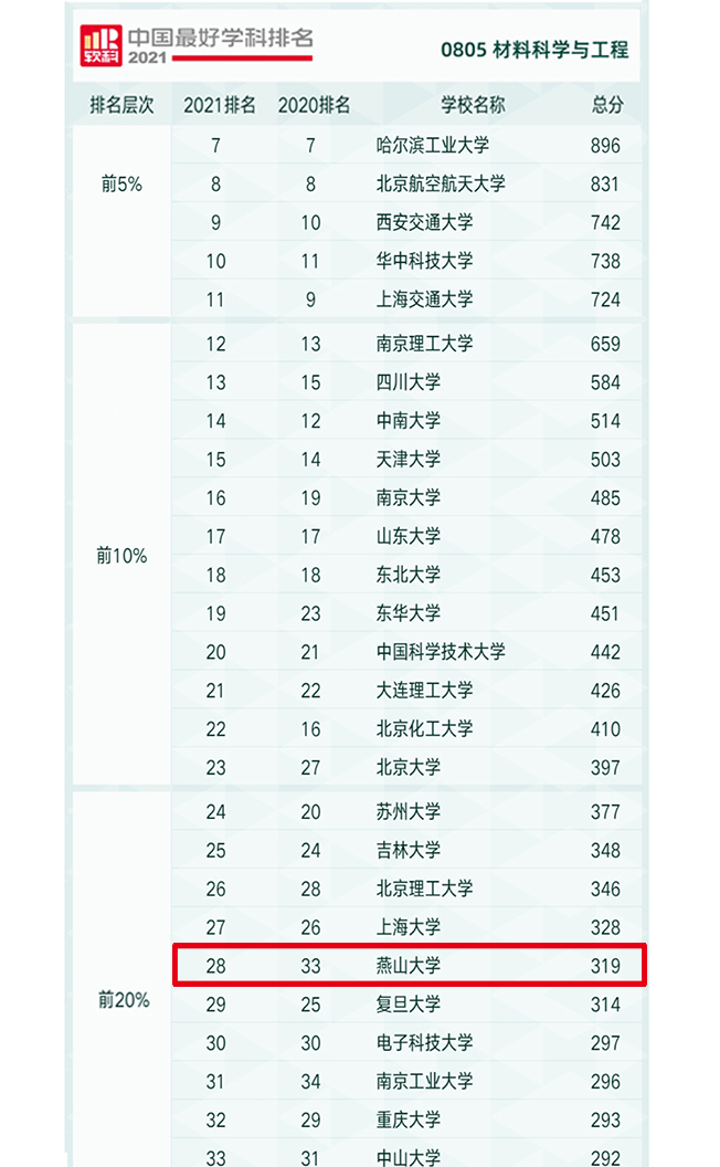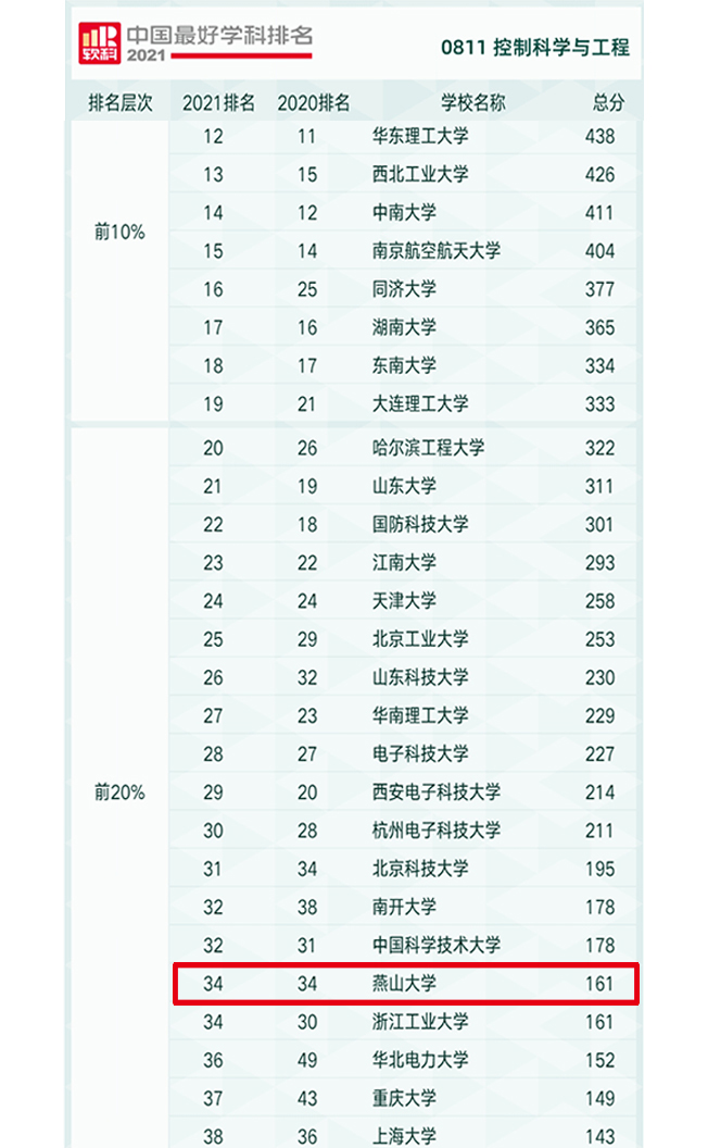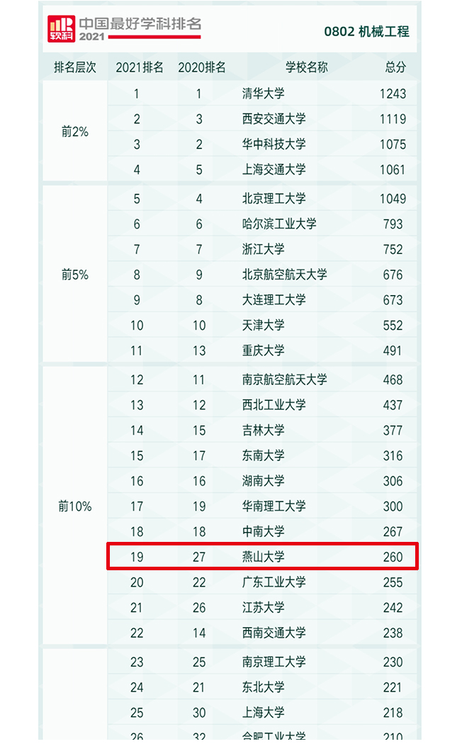 燕山大学共有13个学科上榜。其中,机械工程学科排名位居全国前10%,是河北省高校唯一进入前10%的学科;材料科学与工程、控制科学与工程2个学科进入全国前20%(全省共有5所高校的9个学科进入前20%)。