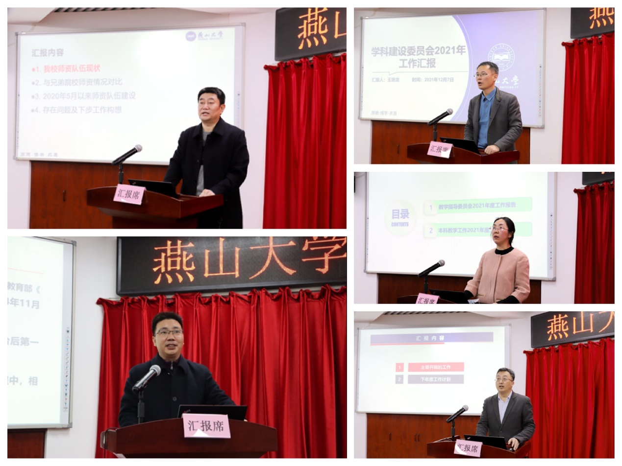 会上,校乐竞体育在线委员会秘书处从履职尽责审议《燕山大学“十四五”规划》等学校重要文件、完善委员会运行机制、组织修订章程、主动开展科研诚信案件调查认定工作等方面作了《燕山大学乐竞体育在线委员会2021年度工作报告》。教学指导专委会从本科教学运行状态、专业建设和教学运行保障等方面,科学技术专委会从各类项目申报立项情况、平台建设、军工资质和专利论文成果等方面,学科建设委员会从“双一流”建设、学科评估和学位点建设等方面,师资队伍建设专委会从学校师资总体情况、“燕山学者”计划实施效果和面临的困难挑战等方面,乐竞体育在线道德委员会从学校科研诚信体系建设、乐竞体育在线不端案件调查处理和工作流程优化等方面分别作了2021年度工作报告。