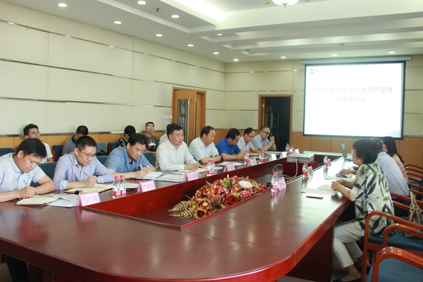 实验室与资产管理处、后勤集团、产业集团、大学科技园等部门分别从学校资产管理体系和经营性国有资产监管工作、学校经营性网点管理情况、校办企业目前经营管理状况和遗留问题解决思路、近年科技成果转化中的科技投入与产出情况等方面向调研组作了详细汇报。