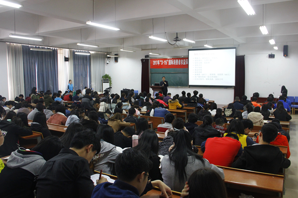 活动在两个分会场同时举行。室内分会场举办的是消费相关法律知识的专场讲座。讲座开始前,市消协秘书长庞世斌总结了过去的一年我市在消费者权益保护方面取得的巨大成绩,展望了未来消费者权益保护的发展趋势,并表示市消协将一如既往地为燕大师生的消费行为保驾护航。随后,名阳保险总经理葛丙哲先生就大学生保险理念的培养和保险消费的具体事宜进行了生动的讲解;市消协副秘书长李庆江针对大学生网络消费集中的特点,从七个方面深入浅出地讲解了学生在网络消费时的注意事项和自我保护的方法,并强调大学生应当树立维权意识,勇于和侵犯自己权益的行为作斗争。超过200名师生听取了这场讲座。