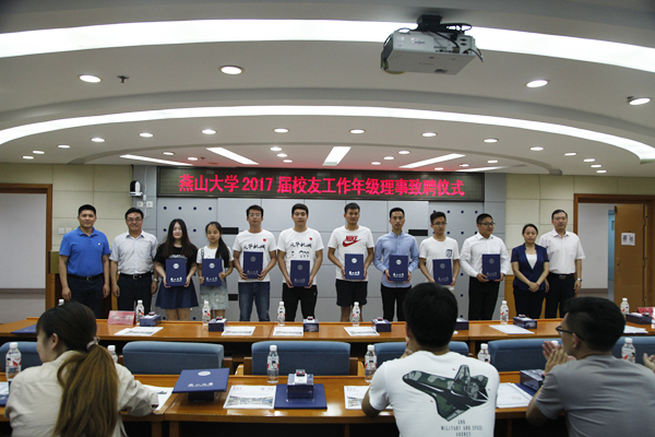 校友办主任孙红磊宣读了燕大校友办[2017]12号文件《关于聘任燕山大学2017届校友工作年级理事的决定》。参会领导为受聘年级理事代表颁发了聘书。校友办为全体与会年级理事送上了印有“燕山大学”LOGO的精致名片盒,希望全体校友能成为燕山大学最好的“名片”。