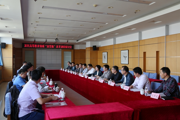 【新闻中心讯】为更好贯彻落实教育部等五部委关于深化高等教育领域简政放权放管结合优化服务改革文件和电视电话会议精神,制定符合我省实际的改革政策,5月9日,由省委改革办专职副主任杨海亭、省教育厅副巡视员董友带队的联合调研组一行10人到燕山大学开展调研工作,当天下午调研组在世纪楼第一会议室召开了调研研讨会,我校校长刘宏民、副校长盛婉玉以及相关职能部门、学院负责人、教师代表参加了会议。
