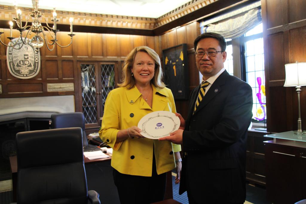 为了表示对我校代表团到访托列多大学的重视与欢迎,托列多大学新任校长Dr. Sharon Gaber和新任教务长Dr. Andrew Hsu亲切会见刘宏民校长一行,并与代表团进行了友好交流。刘宏民校长对Sharon校长和Hsu教务长的荣任表示祝贺,并真诚邀请两位校领导能够尽早访问燕山大学,进一步推动两校间在科研、师生交流、教师培训、选派专业教授等方面的实质性合作。Sharon校长和Hsu教务长都非常珍视与燕山大学30多年的合作历史,表示会与托列多大学各学院沟通,整合资源,做好与燕山大学各个领域的对接。