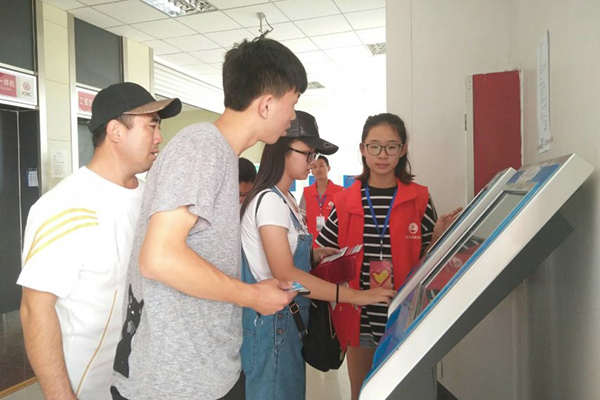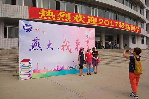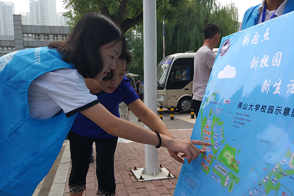 志愿者们身穿蓝色马甲活跃在校园各个角落,乐此不疲地给接踵而至的新生家长指路、解答他们的问题。在咨询点、食堂外,志愿者们设置了家长休息区并免费提供绿豆汤、矿泉水、纸巾供新生家长取用;在临时停车场,他们配合安保人员指挥车辆;在东西区一卡通充值中心,他们耐心细致地为新生讲解如何绑定银行卡、转账等业务。一张张温馨的笑脸,一句句贴心的话语,传递着真诚与友爱,是他们带给大一新生最美的名片。燕山大学图书馆前以“燕大,我来了!”为主题的留影板成为此次迎新活动的一大亮点,许多新生和其家人在此合影留念。一位理学院的学生家长表示:“这个活动很有意义,很温馨,今天我们全家人在孩子的大学拍一张全家福我觉得很开心,这张照片很有收藏意义。”