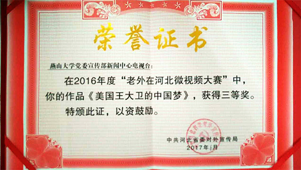 【新闻中心讯】近日,由河北省委对外宣传局和河北广播电视台联合举办的首届“老外在河北微视频大赛”颁奖典礼在河北广播电视台举行。燕山大学电视台制作并报送的视频《美国王大卫的中国梦》荣获大赛三等奖。