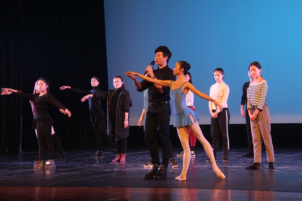 伴随着优美典雅的《古典女子四人舞》,演出正式拉开了序幕。首先,国家一级演员余波老师为现场观众做了简短的芭蕾知识讲座,简要讲解了芭蕾舞在世界与中国的发展史以及不同国家的芭蕾学派。多位中央芭蕾舞专业演员向观众演示“开、绷、直、小跳、擦地”等芭蕾基本动作。一段“火药味十足”的旋转竞技更是引起现场观众的欢呼,在交流互动环节,我校同学还踊跃上台,跟随舞者学习芭蕾舞的基本动作,亲身感受芭蕾舞的魅力。
