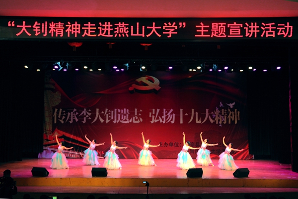 此次宣讲会以李大钊同志的生平事迹为主线,通过红色故事演讲、歌曲、舞蹈、乐亭大鼓、诗朗诵等形式将大钊精神表现的淋漓尽致。开场舞《梦起东方》激昂的歌曲伴奏,优美的舞姿点燃了观众的热情,拉开了活动的序幕。红色演讲《伟大庭训奠基石》《改造旧寺建学堂》《英明浩气万古存》分别讲述了大钊童年、青年直至逝世时期的传奇故事,详细地解读了李大钊生平的伟大事迹和贡献,现场观众已然跟随演讲者走进了那段难忘的历史,峥嵘的岁月;歌曲《悠悠滦水情》气势磅礴的鼓声,欢快跳跃的节奏,唱出了大钊同志对乡亲故里的眷恋和对冀东人民的热爱;《飞跃光荣与梦想》《我爱你中国》慷慨激昂的歌曲唱出了对革命先烈的敬仰以及对国家深深的热爱,引起了观众的共鸣,演出现场掌声不断。舞蹈《红旗颂》以代表热情与力量的红色元素为主要背景,红色服装、红色旗帜、红色灯光相互交汇,给人以视觉冲击,让人眼前一亮。红色演讲《建党之歌永远唱响》赞扬了李大钊、陈独秀等革命先烈对中国共产党建立做出的伟大贡献。宣讲会以配乐诗朗诵《红色追随》结尾,激励大学生们要紧跟党的步伐,传承并发扬李大钊精神。