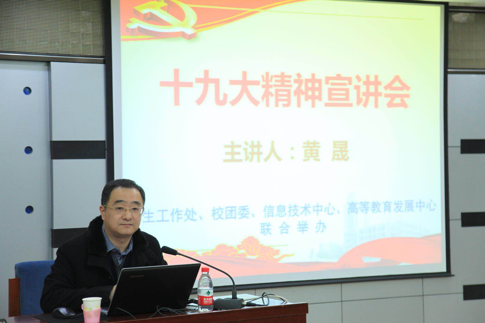 黄晟结合自己学习十九大精神的心得体会,从十九大报告主题和结构入手,通过“数读报告”向大家介绍了报告中出现的关键词、核心字,对十九大报告提出的新思想、新观点、新论断和新要求作了全面深刻的解读。同时,他还就十九大报告中与高等教育相关的要点进行了详细的剖析,并着重阐述了习近平教育思想,即要深刻领会“四为服务”的教育方针;深刻领会立德树人的教育根本任务;深刻领会扎根中国大地的办学要求;深刻领会德才兼备、德学兼修的育人要求;深刻领会对教师的德才要求;深刻领会加强高校党建的保障要求。最后,他号召全体与会人员要认真学习习近平新时代中国特色社会主义思想,用习近平教育思想指导学校建设发展。