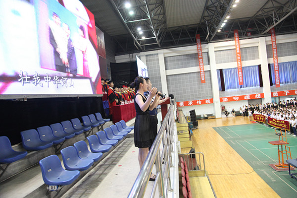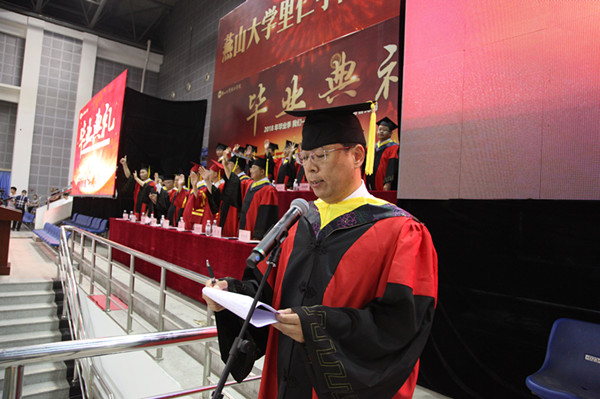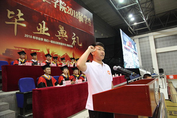 在土木工程2班毕业生高洪照同学的领誓下,全体毕业生举起右臂,郑重宣誓,表达了牢记校训、不辱使命、热爱里仁、为校争光的誓言。