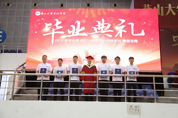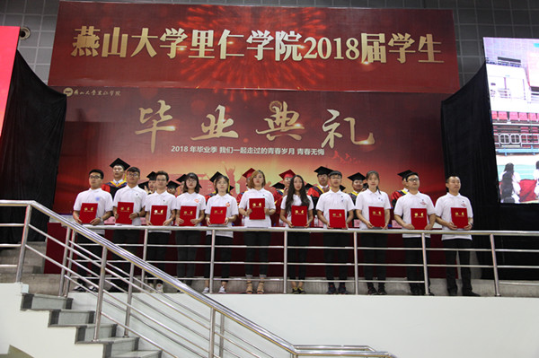 里仁学院正处级专职辅导员王国伟宣读了《关于表彰燕山大学里仁学院2018届省级优秀毕业生的决定》。省级优秀毕业生学生代表依次登台接受领导颁发证书。