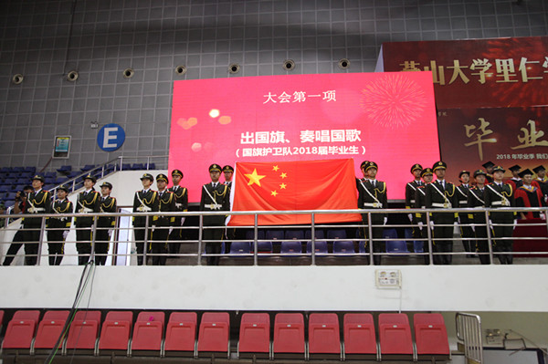 2014级18名国旗护卫队队员最后一次为学院出旗。他们跟随着铿锵有力的口号,迈着整齐的步伐,带着对母校依依不舍的深情,出色地完成了出旗任务。典礼在庄严的国歌声中拉开了序幕。