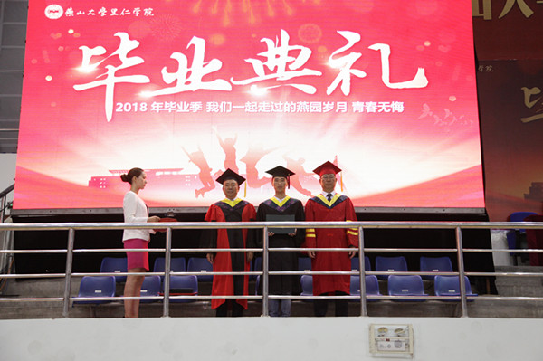 刘宏民和里仁学院院长王洪斌一同为毕业生代表授予学位。