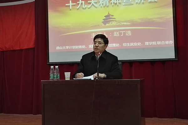 【新闻中心讯】1月4日上午,党委常委、副校长赵丁选在西校区理学楼404会议室为基层单位党员干部宣讲十九大精神。计划财务处、实验室与资产管理处、招生就业处、理学院科级以上干部参加了学习,会议由理学院党委书记张世良主持。