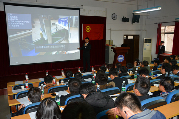 首先为作品展示环节,参赛选手在机械馆天井中向评委老师及同学们展示自己的作品并且做了简单的介绍,并在现场运行各自的装置。参展作品共有十二件进入决赛,每一件均有独具匠心之处。答辩环节在机械馆J3教室进行,各组负责人登台答辩并进行PPT展示,在PPT中,同学们形象生动的展示出自己作品的各个方面,在答辩结束后,评委老师们从装置构造、装置原理、设计思路、操作方式和视频展示等方面来进行提问,并为学生提供了改进的思路和建议。
