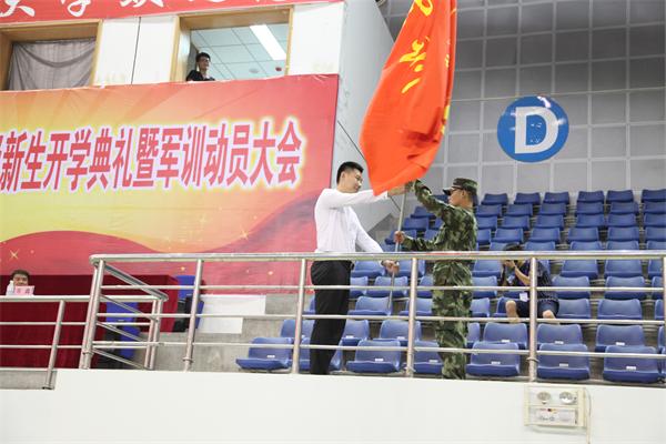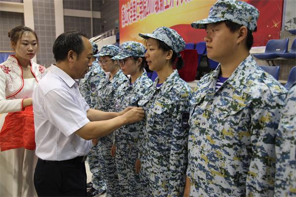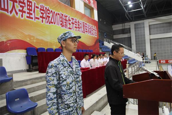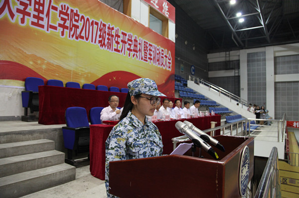 主席台领导为2017级学生军训教官颁发聘书。里仁学院从在校退伍大学生士兵中挑选出的学习优秀、军事素质过硬的31位学生承担军训教官的任务。