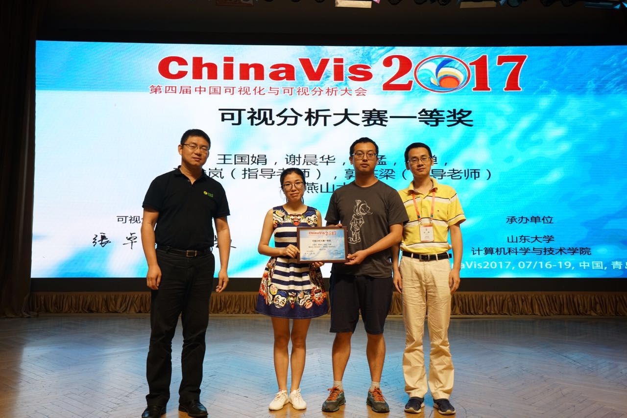 【新闻中心讯】近日,第四届中国可视化与可视分析大会(ChinaVis2017)在山东青岛举行。在本届会议的数据可视分析挑战赛环节,我校信息科学与工程学院教师聂俊岚、郭栋梁指导的王国娟、谢晨华研究生团队从全国68支参赛队中脱颖而出,与天津大学、东北大学并列获得挑战赛一等奖,这是我校蝉联该赛事最高荣誉。在2016年的第三届中国可视化与可视分析大会上我校也获得了该项赛事一等奖。