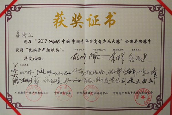 姜俊卫是我校艺术与设计学院音乐系15级硕士研究生,师从李宗堂教授,在研究生期间专业成绩突出,在2017 “High C中国”青年男女高音声乐大赛河北赛区中,一鸣惊人,取得了河北赛区特等奖的好成绩,直接入围全国总决赛。
