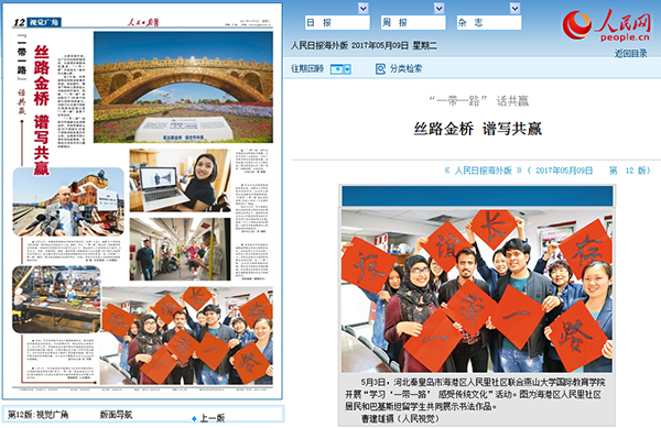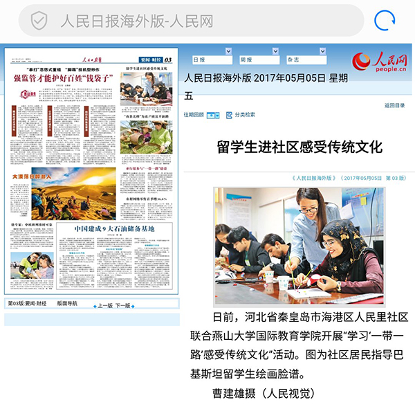 【新闻中心讯】5月5日,5月9日,《人民日报<海外版>》两次刊登我校巴基斯坦留学生到海港区人民里社区“感受传统文化”的活动图片。此外,该次活动图片报道也刊登在5月8日《秦皇岛晚报》头版。