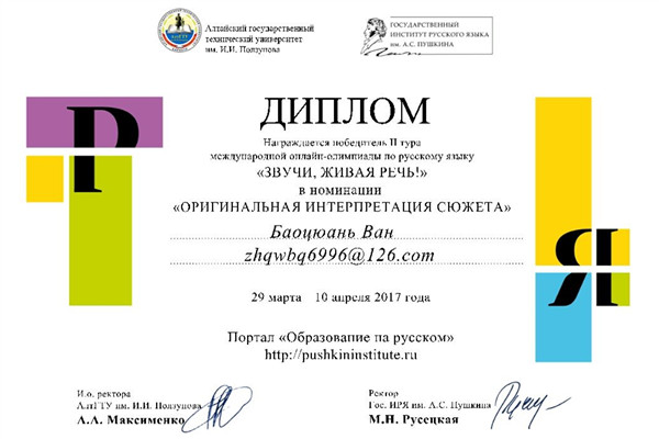 【新闻中心讯】3月29日到4月20日,国际俄语奥林匹克竞赛“飞扬吧,灵动之语”如期落幕。我校俄语系学生王宝泉在竞赛中获得电影情节演绎独创奖。据悉,该竞赛共有来自50多个国家的近千名学生参赛,经过激烈角逐,最终只有16人获得奖项。