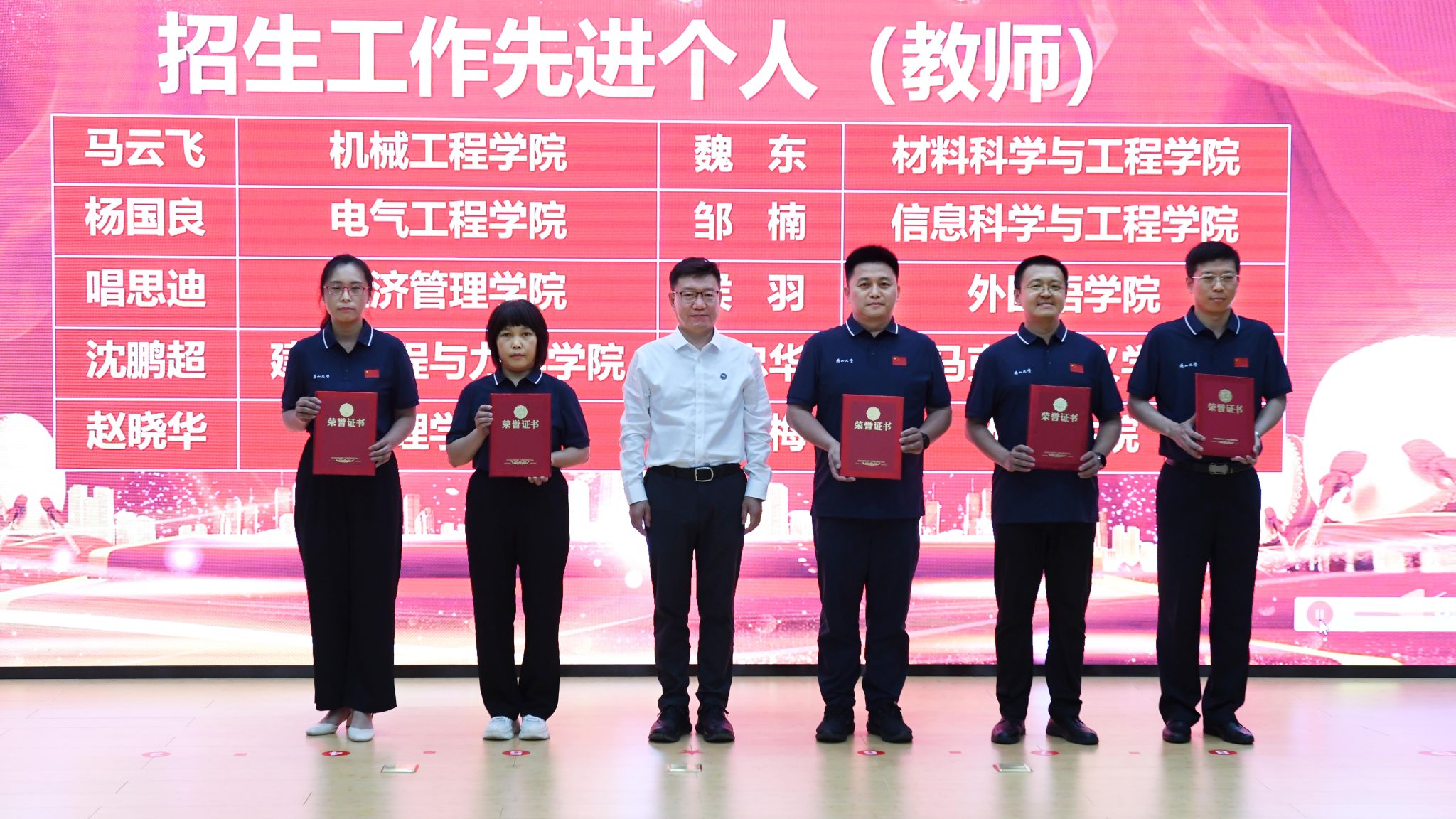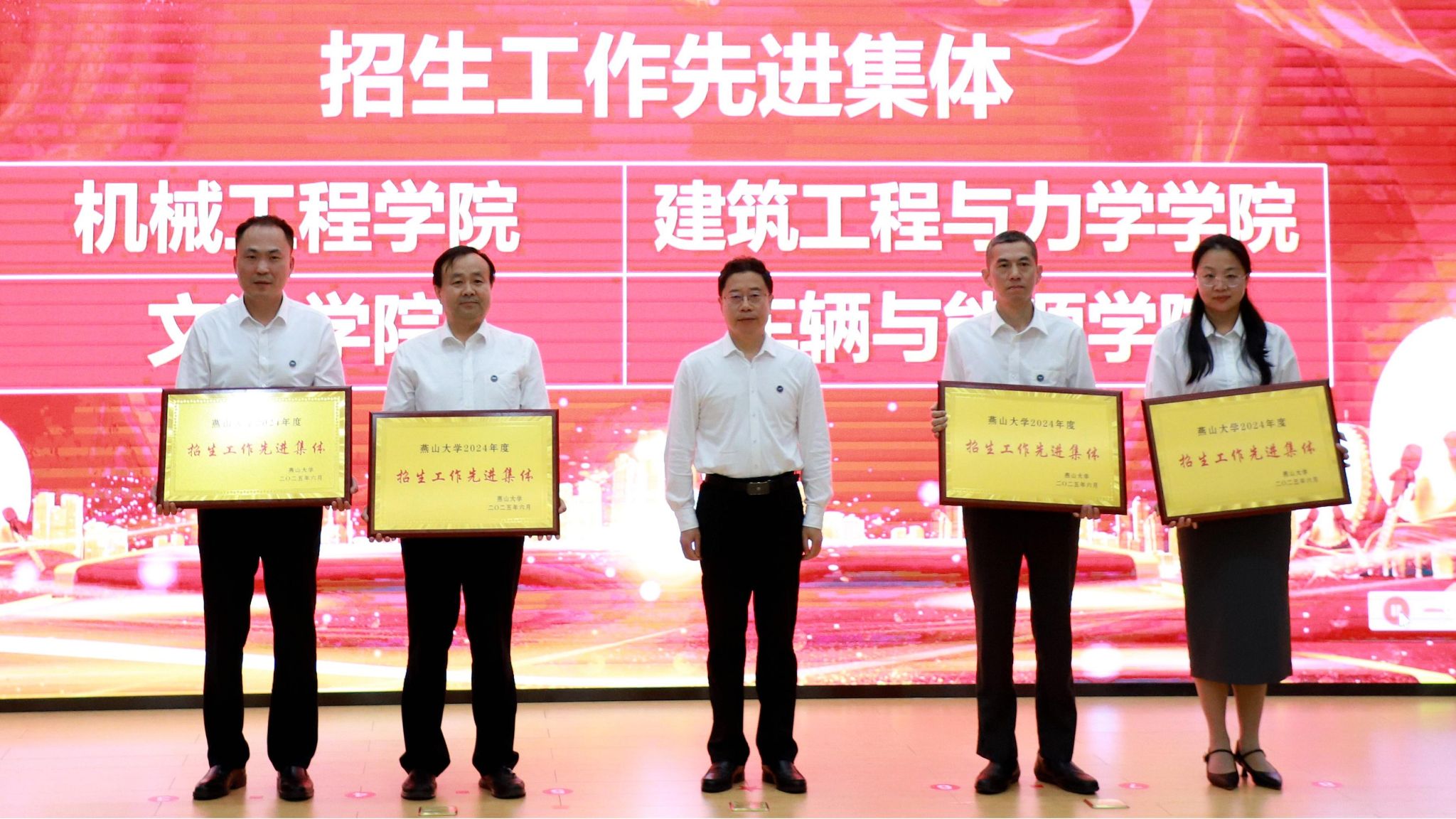 会上,党委副书记蔡星周宣读了《关于表彰燕山大学招生工作先进集体和先进个人的决定》。党委书记赵险峰等校领导分别向荣获学校“招生工作先进集体”“招生工作先进个人”“招生工作突出贡献个人”颁发了奖牌和证书,并向他们表示热烈祝贺。