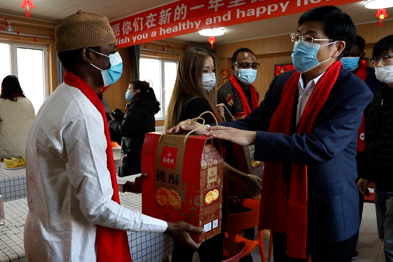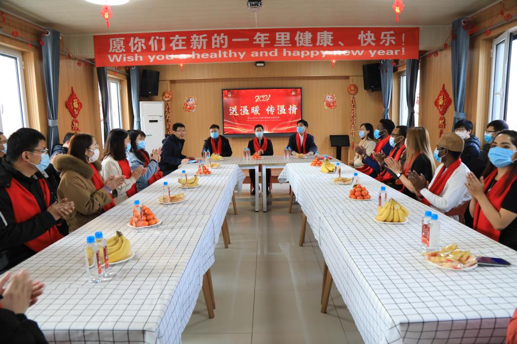 在13组团2楼会议厅的慰问会上,校领导与中外学生代表座谈。校领导向同学们介绍了中国在过去的一年里取得的伟大抗疫成果以及学校取得的一系列喜人的发展成就,并展望了学校美好的未来,希望同学们在全球疫情依然严峻复杂的形势下,响应国家号召,遵循学校防疫政策,留校过好牛年春节。同学们向校领导汇报了假期的生活情况,感谢校领导和老师们的关心慰问,并表示集中住宿条件好,在校学习生活都有保障,家长十分放心,自己也将继续坚定信心,在配合学校做好疫情防控工作的同时,积极努力学习。尽管是第一次留校的春节,但学校对自己生活各个方面的关心,以及种种便利措施让这个“不在家的”春节过的如同“在家一样的”温暖。