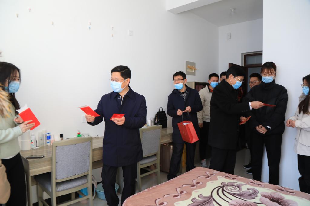 在13组团A座3单元留校学生宿舍,校领导认真查看了留校学生的生活和学习环境,仔细了解宿舍供暖、饮水及住宿安全情况,详细询问同学们各自家乡的疫情现状和在校学习生活状况,叮嘱大家时刻注意科学防控疫情,互相关心关爱,和家长、老师保持联系,合理安排假期时间,有困难随时向学校反映,学校将及时解决落实。赵险峰与赵丁选代表学校为留校学生送上了中国传统的新春礼包,祝同学们春节快乐。