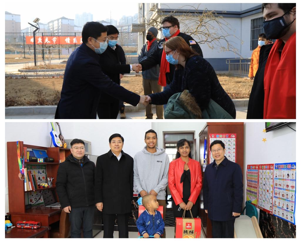在13组团B座1楼,校领导看望慰问了5名外教和1个留学生家庭,对外教的辛勤工作表示感谢,为他们送上了富有中国传统特色的新春礼包,并祝他们中国新年快乐。