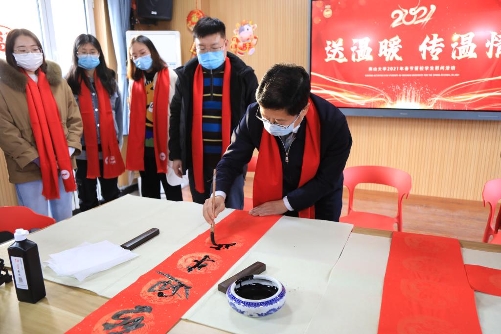 赵险峰、赵丁选代表学校为同学们送上节日慰问的大礼包,祝福同学们新春快乐。赵险峰还亲笔书写了福字、春联,与中外学生共同体验中国新春佳节的喜庆气氛。(编辑 蔡常山)