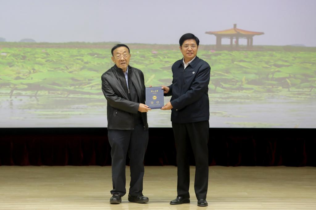 我校还聘任叶连松为燕山大学名誉教授,校长赵丁选为叶连松颁发了聘书,并赠送校庆纪念品。
