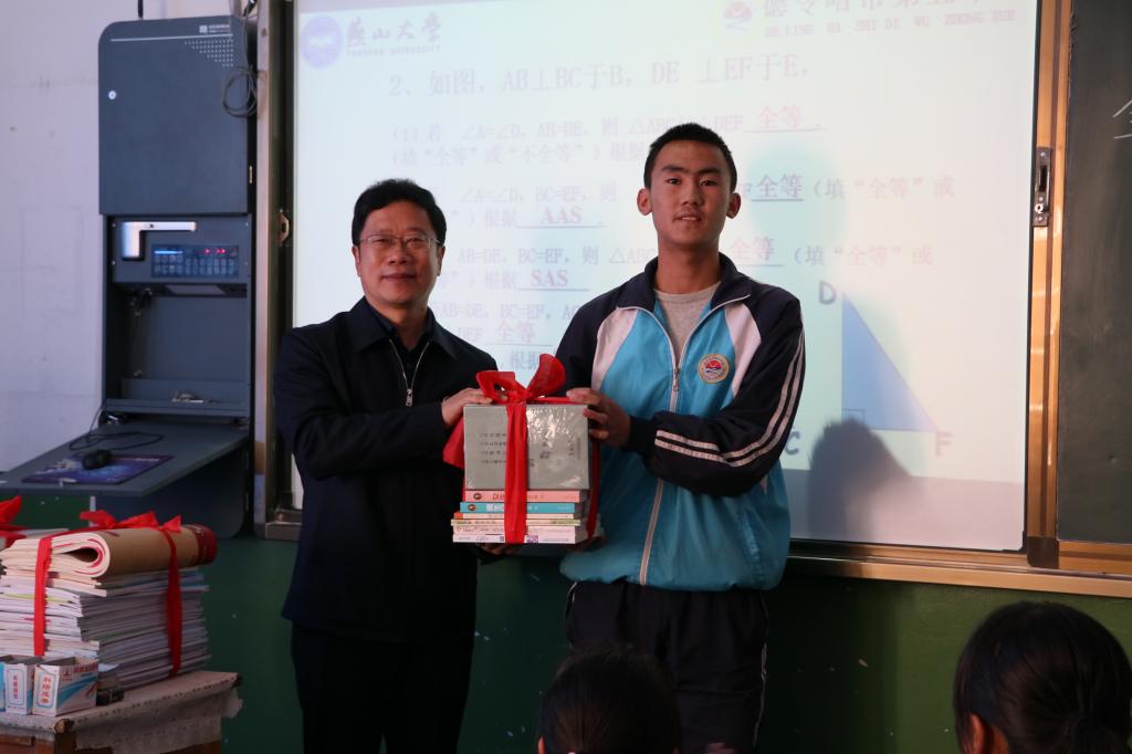16时,调研组一行又来到我校研支团另一服务地德令哈市第五中学。德令哈市第五中学地处偏僻的柯鲁柯镇,是全市唯一一所九年一贯制学校,生源构成复杂、生活条件艰苦、教学师资紧缺。调研组听取了校长陈斌华对于学校概况以及研支团工作开展情况的汇报,并就下一步合作进行深入交流。赵险峰等还深入校园及课堂,认真旁听燕山大学研支团教师日常授课,仔细了解研支团成员工作、生活状况,并对研支团的教学工作进行了高度赞赏。赵险峰代表燕山大学向第五中学学生代表赠送书籍,表扬了他们认真向学、善良淳朴的品格品质,也祝福他们学有所成、成为对国家、对社会、对家乡有用的人才。