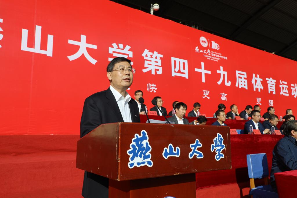 10月3日早8:00,运动会开幕式在第二体育场举行。开幕式由学生工作处副处长郝海滨主持。校党委书记赵险峰宣布第四十九届体育运动会开幕。副校长赵永生致开幕词,他表示,在全国人民取得抗击新冠肺炎疫情重大战略成果、中秋节与国庆节双节来临之际,燕山大学迎来了第四十九届体育运动会的召开。体育是提高人民健康水平的重要途径,是满足人民群众对美好生活向往、促进人的全面发展的重要手段。我校不久前刚举办完百年校庆庆典,一路走来,无论是筚路蓝缕的东重时期,白手起家的南迁之际,还是负重致远的燕大时期,重视体育都是学校的优良传统,体育锻炼蔚然成风贯穿了燕大的办学历史。经过四十八届校园运动会的发展,体育早已成为燕山大学校园文化生活的重要组成部分,成为学校落实立德树人根本任务的重要载体。过去的一年,学校的体育教学改革不断深化,体育教学水平稳步提高,学生体质测试指标明显提升,群众性体育活动蓬勃发展。一年来,在健美操、花样跳绳、排球等各类大学生竞赛项目中,学校共获得国家级竞赛第一名1项、第二名1项;省级竞赛第一名15项、第二名6项。步入新时代、开启新征程,我们要用实际行动展现“更高、更快、更强”的体育追求,也希望所有燕大人拥有健康体魄,成就精彩人生。